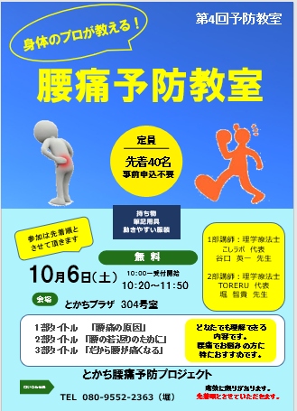 腰痛予防教室開催します!10月6日 10:00受付開始 10:20~12:00