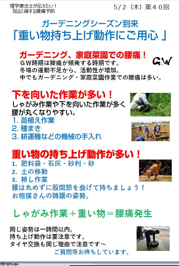 FM WING76.1MHz 毎週木曜日 朝8:20~ 「知ると得する腰痛予防!」 2019 5/02 ラジオ番組 TORERU(トレル)筋膜✕整体 2019-05-02 5月2日のブログでも同じ内容で記載あります。宜しくお願い致します。 ラジオ番組 TORERU(トレル)筋膜✕整体 重い物の持ち上げ方 身体の重心のコントロール