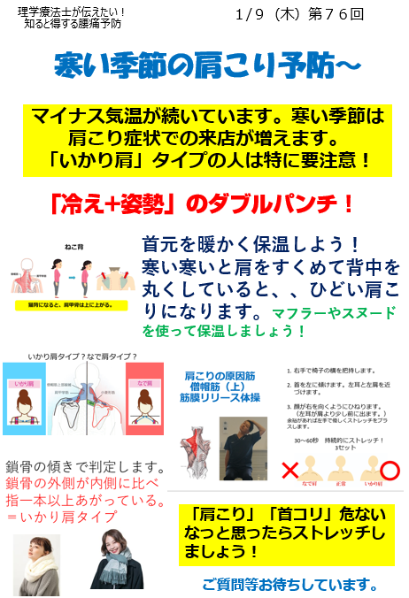 FM WING76.1MHz 毎週木曜日 朝8:20~ 「知ると得する腰痛予防!」 2020 1/09 ラジオ番組 TORERU(トレル)筋膜✕整体 2020-01-09 ラジオ番組 TORERU(トレル)筋膜✕整体 浮き指ストレッチ! 寒い季節の肩こり予防〜