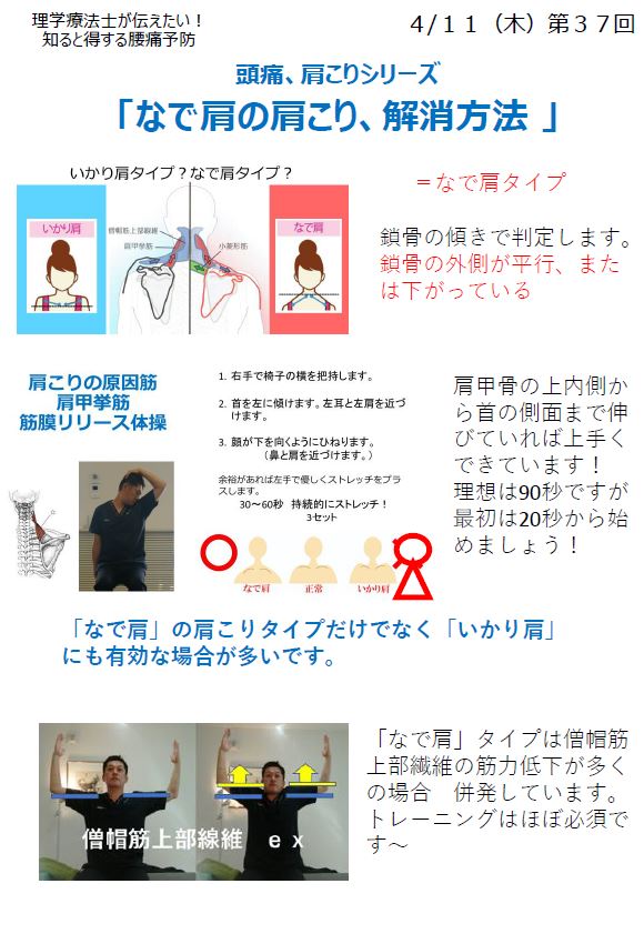 FM WING76.1MHz 毎週木曜日 朝8:20~ 「知ると得する腰痛予防!」 2019 4/11 ラジオ番組 肩こり TORERU(トレル)筋膜✕整体 2019-04-11 来週はいかり肩のストレッチです!当てはまる人も多いストレッチです。とても効果的ですので是非、お聞きください。よろしくお願いします! ラジオ番組 肩こり TORERU(トレル)筋膜✕整体 なで肩を治す筋トレ!体操の意味まで理解すると継続できます。 姿勢からくる腰、両足のしびれ